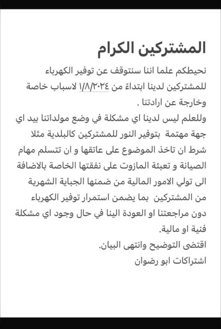 بدء توقف مصادر الكهرباء البديلة عن العمل في هذا التاريخ
