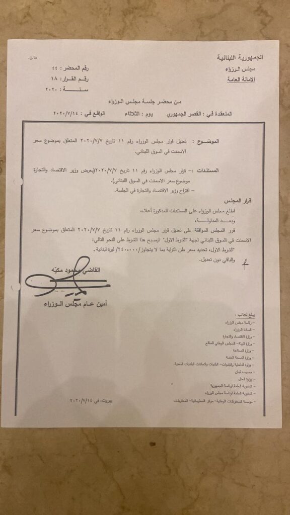 سبق ان حدد مجلس الوزراء بقراره رقم11تاريخ2020/7/7 سعر طن الاسمنت ب65 دولار ثم تم انزال السعر الى 240 الف ليرة اي اقل من ثلاثين دولار بقرار رقم18 تاريخ 2020/7/14 .