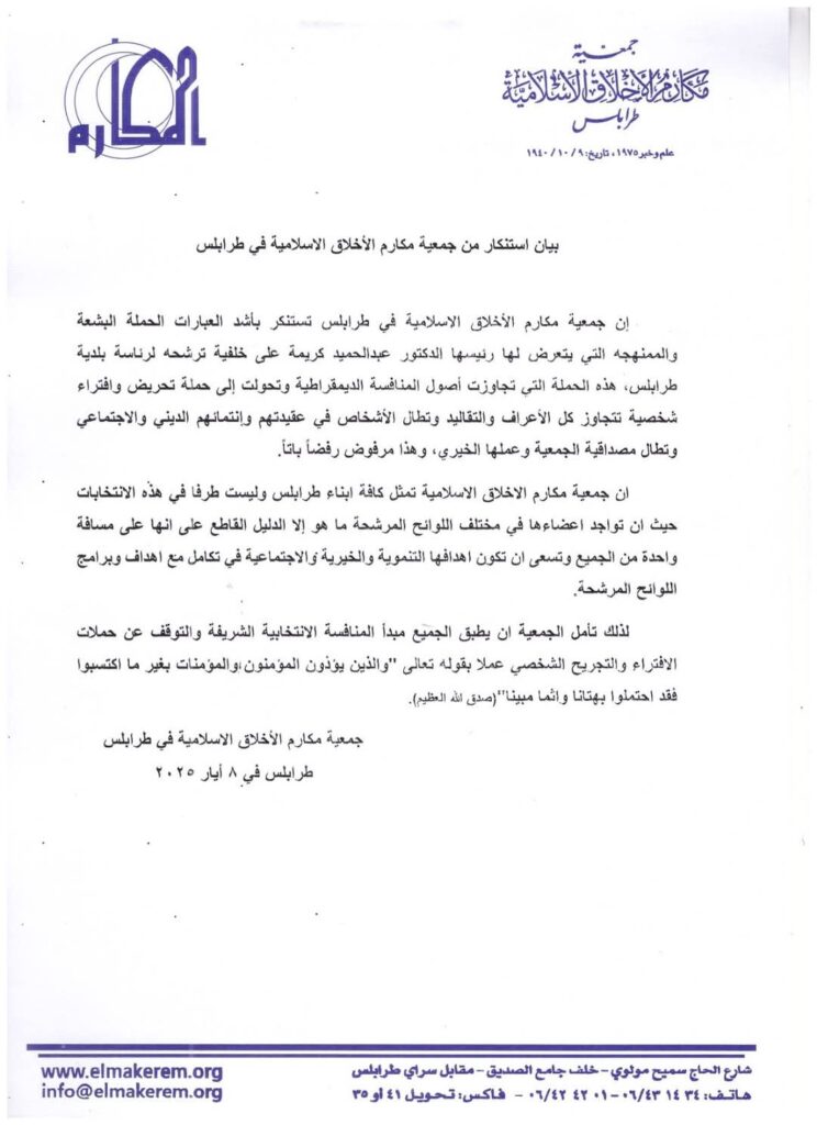 إن جمعية مكارم الأخلاق الاسلامية في طرابلس تستنكر بأشد العبارات الحملة البشعة والممنهجه التي يتعرض لها رئيسها الدكتور عبدالحميد كريمة على خلفية ترشحه لرئاسة بلدية طرابلس، هذه الحملة التي تجاوزت أصول المنافسة الديمقراطية وتحولت إلى حملة تحريض وافتراء شخصية تتجاوز كل الأعراف والتقاليد وتطال الأشخاص في عقيدتهم وانتمائهم الديني والاجتماعي وتطال مصداقية الجمعية وعملها الخيري، وهذا مرفوض رفضاً باتاً.