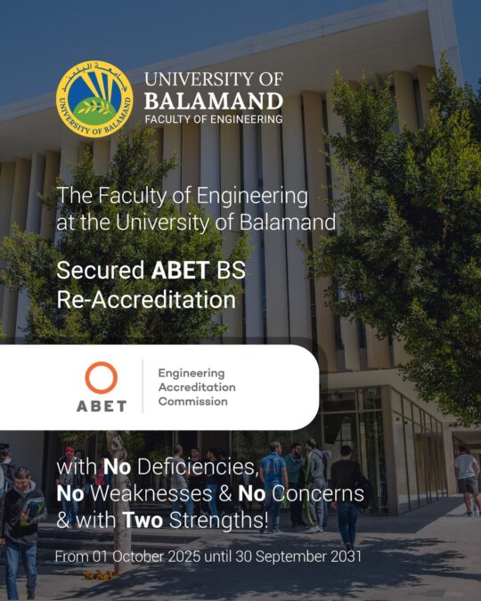 حقّقت كليّة الهندسة في جامعة البلمند إنجازًا أكاديميًا استثنائيًا بتجديد اعتماد ABET لجميع برامج البكالوريوس الخمسة في الهندسة المدنية، والكهربائية، والكيميائية، وهندسة الكمبيوتر، والميكانيكية، وذلك من دون أي نواقص أو ملاحظات أو نقاط ضعف. كما نال برنامج الهندسة المدنية إشادتين رسميّتين من لجنة الاعتماد، في سابقة تُعد الأولى من نوعها في لبنان، للفترة الممتدة بين 1 تشرين الأول 2025 و30 أيلول 2031.