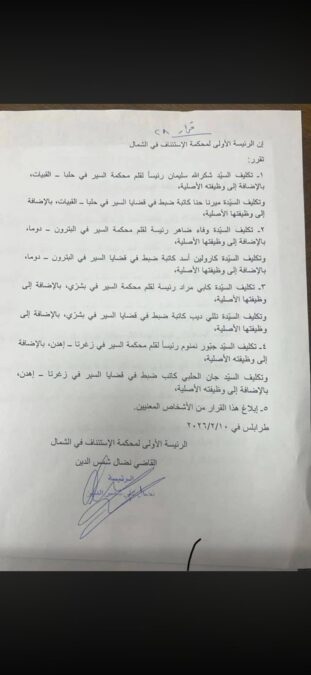 فقد صدر بتاريخ ١٠ / ٢ / ٢٠٢٦ قراراً قضى بتكليف عشرة مساعدين قضائيين لكتابة ورئاسة أقلام النيابة العامة ومحاكم السير في الشمال وعكار ، دون وجود أي سُني من ضمنهم،