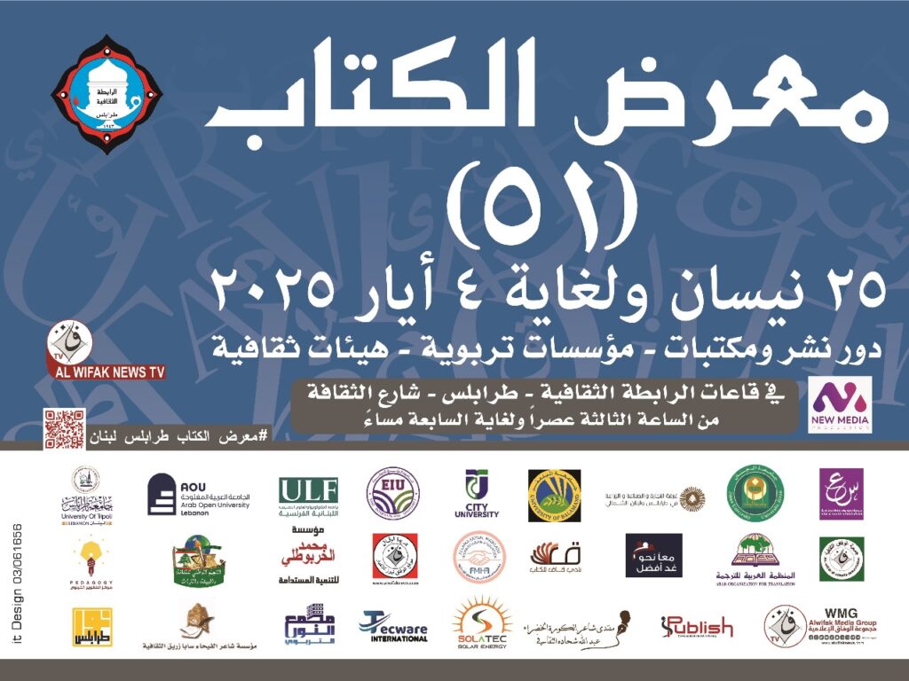 معرض الكتاب ٥١ لهذا العام في قاعات الرابطة الثقافية طرابلس لبنان / شارع الثقافة من ٢٥ نيسان ولغاية ٤ ايار يوميا من الساعة الثالثة عصرا وحتى السابعة مساء
