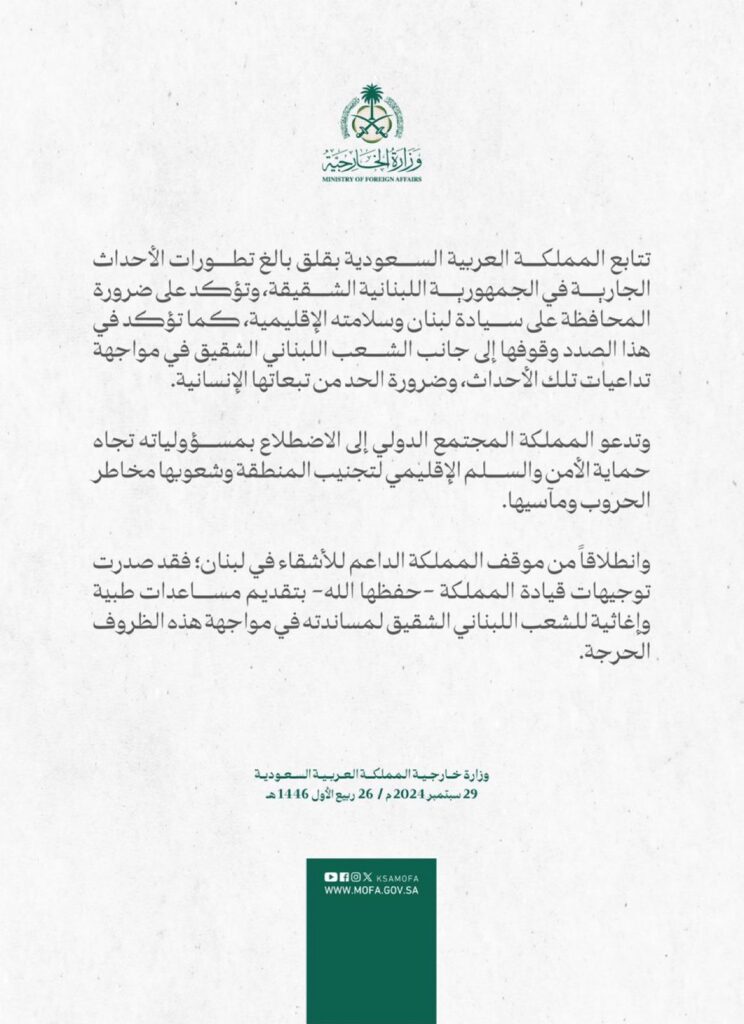 بيان المملكة| أرشيف / 2024-09-30 بيان المملكةبيان للمملكة العربية السعودية تعبر فيه كما دائما عن تضامنها ودعمها ووقوفها إلى جانب الشعب اللبناني الشقيق.مرتبط اقرأ المزيد صباح الخيرأرشيف يعرب الاتحاد الأسترالي للمجالس الإسلامية (AFIC) عن إدانته العميقة وفزعه إزاء التدنيس الأخير للكتب المقدسة للسيخأرشيف خلدون الشريف حيّا شجاعة أهل الجنوب: هم أصحاب الأرض وعنوان العزة والكرامةأرشيف, مبادرات محلية, منوعات بيان صادر عن مكتب النائب السابق كاظم خيرأرشيف